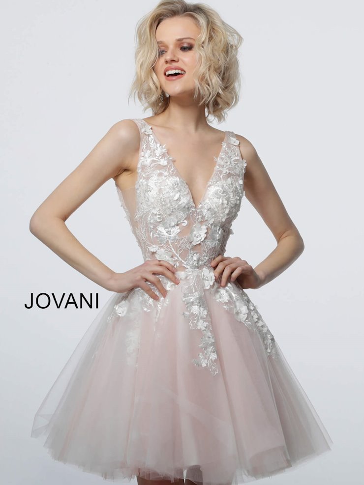 We love this blush cocktail dress and its' fun, tulle skirt ready for dancing! The deep V neckline is mirrored with a plunging V-back. The cascading floral appliques and beaded bodice add extra shimmer to make for a perfect combo on a special night!